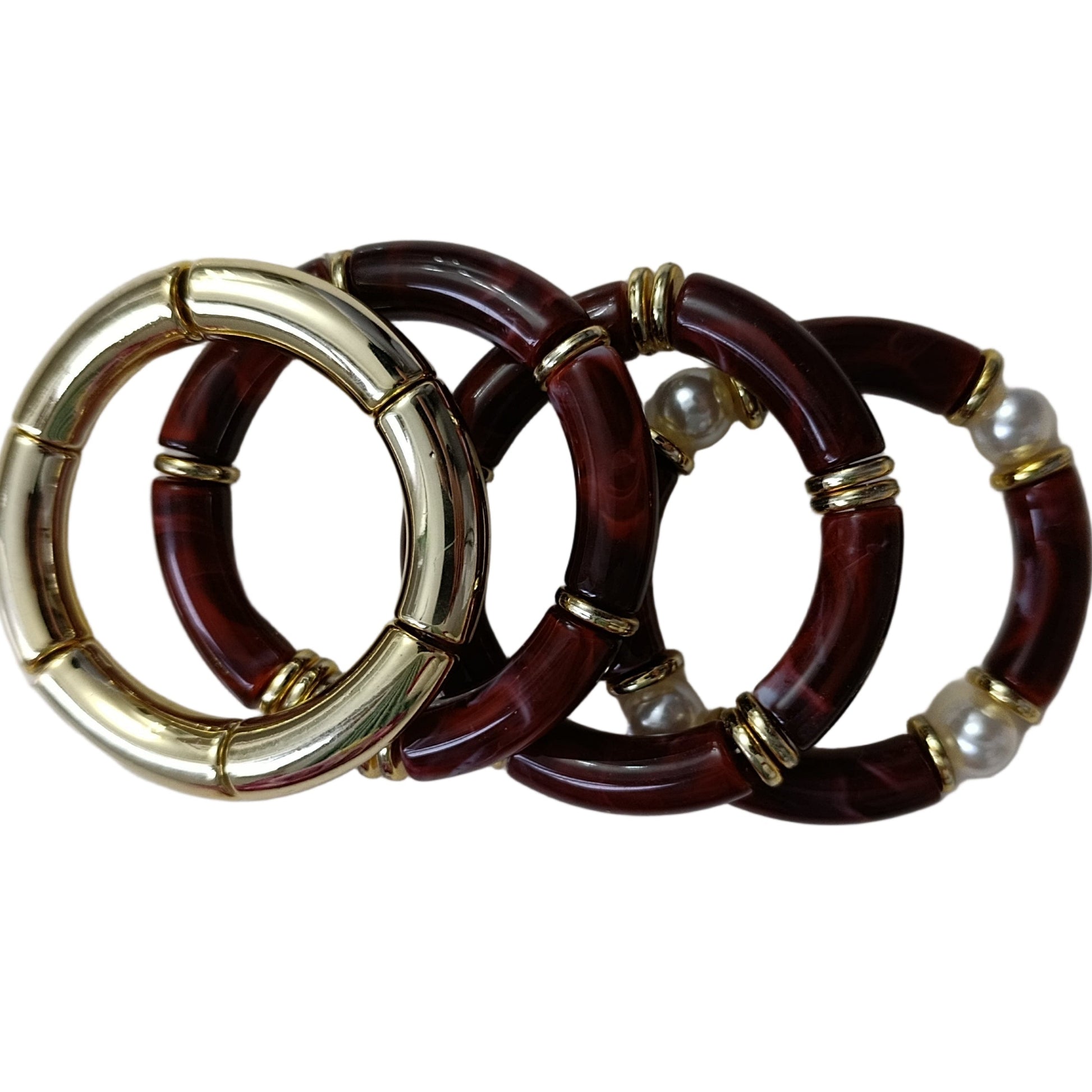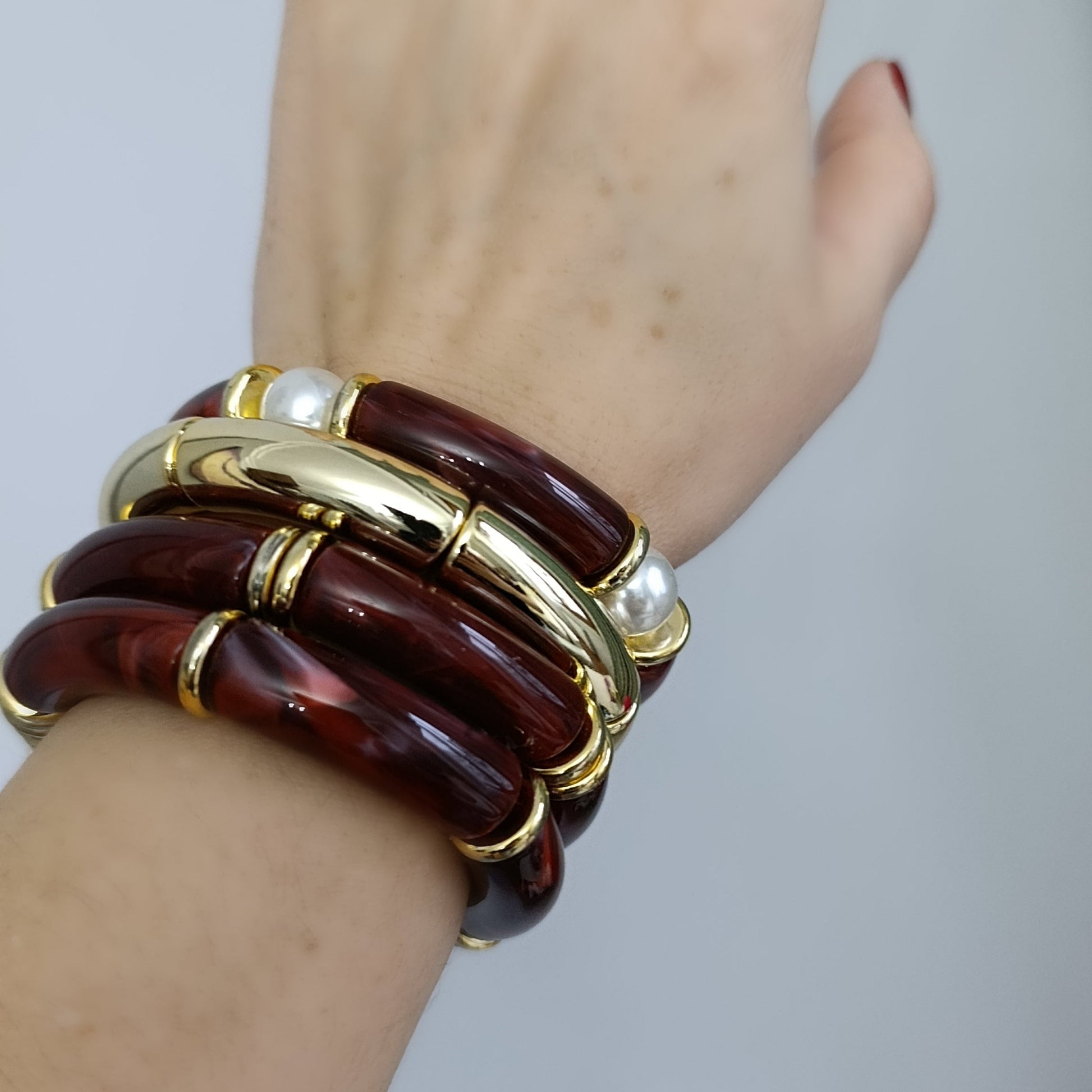 Gold Bordo Tonlu ve İncili Dörtlü Lastikli Bileklik