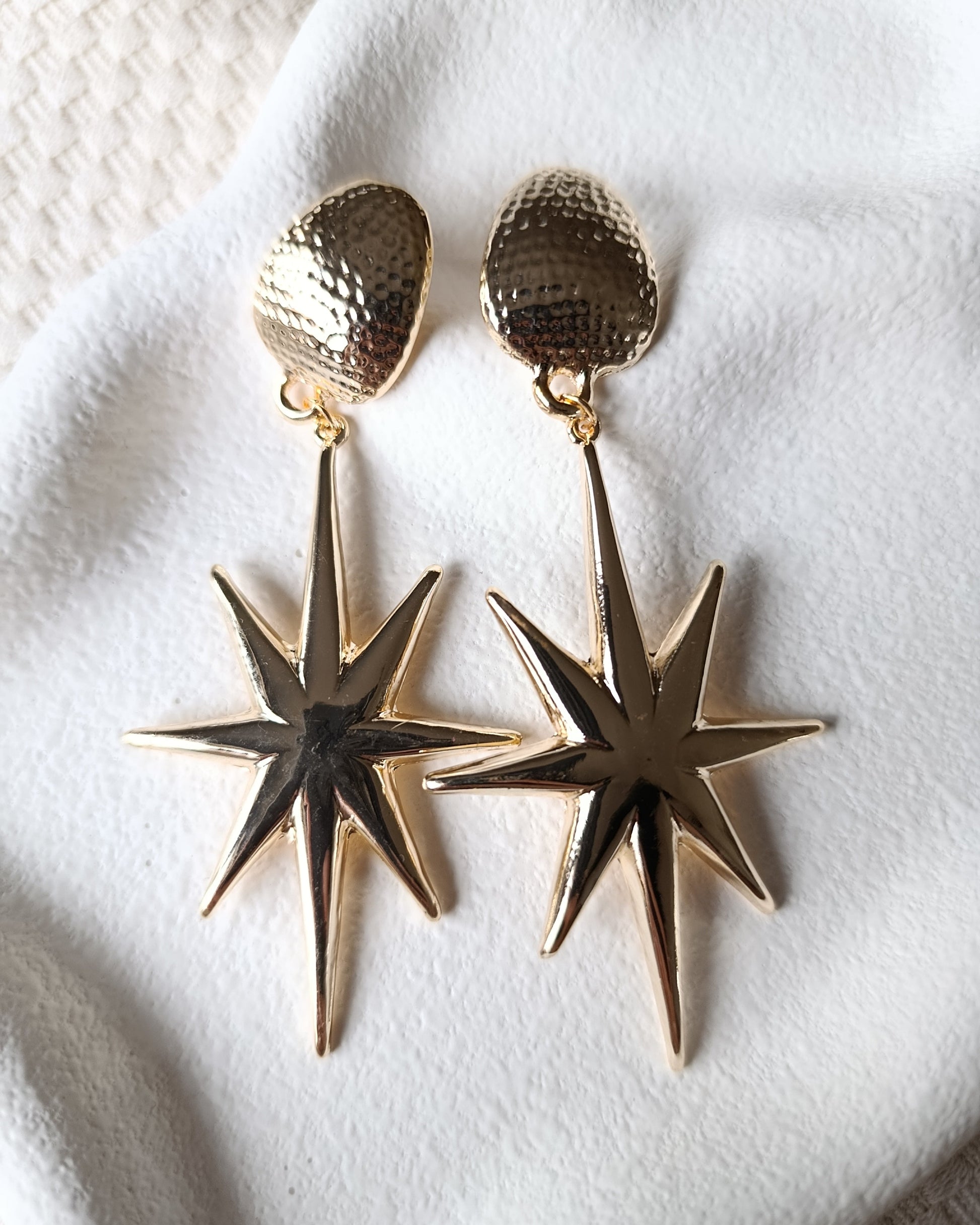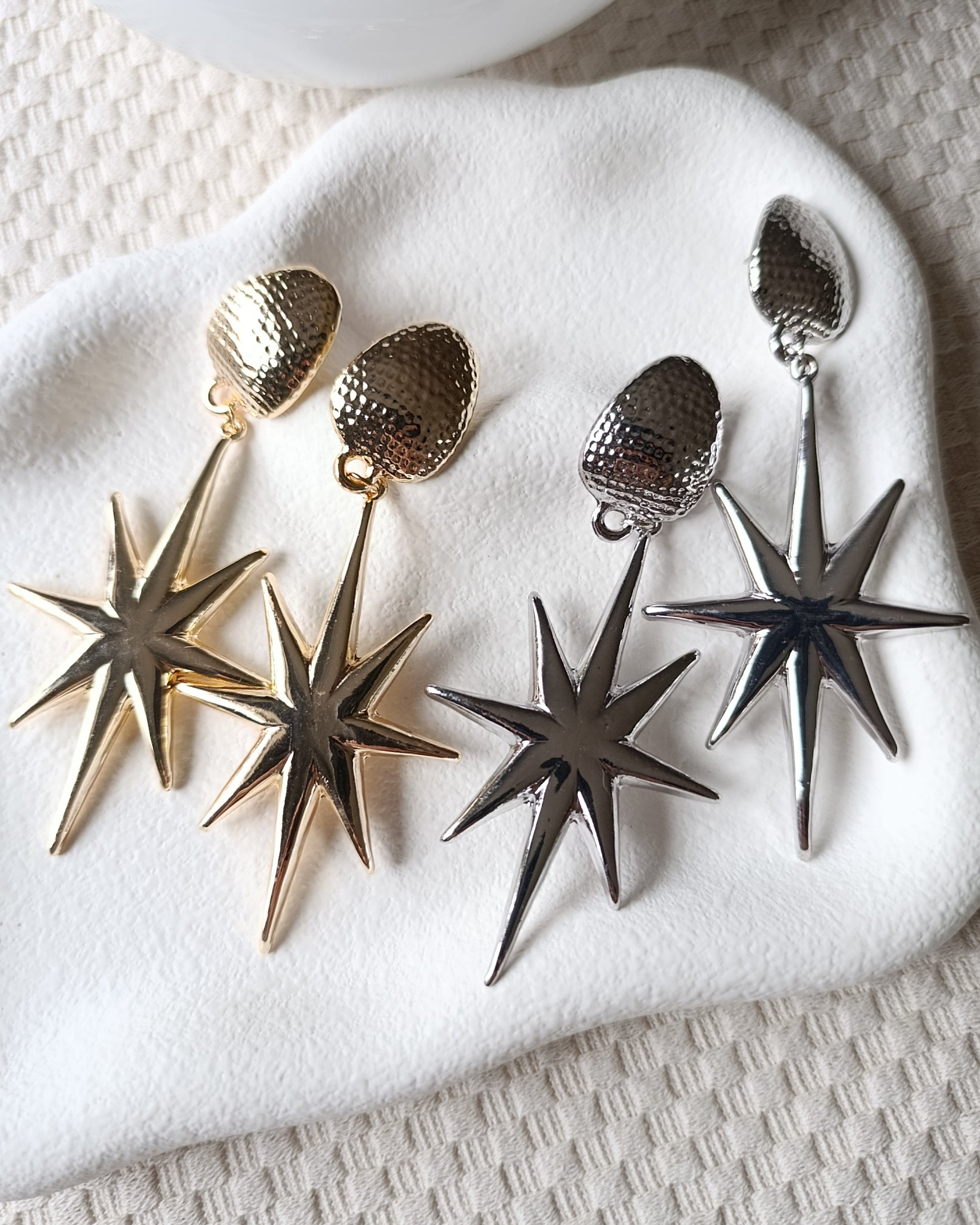Gecenin en parlak yıldızı siz olun! Bu sallantılı yıldız küpeler, büyüleyici bir şıklık sunuyor. Dokulu üst kısmı ve keskin hatlı yıldız figürüyle bu parça, sıradan bir aksesuar değil, tam bir statement parçasıdır.