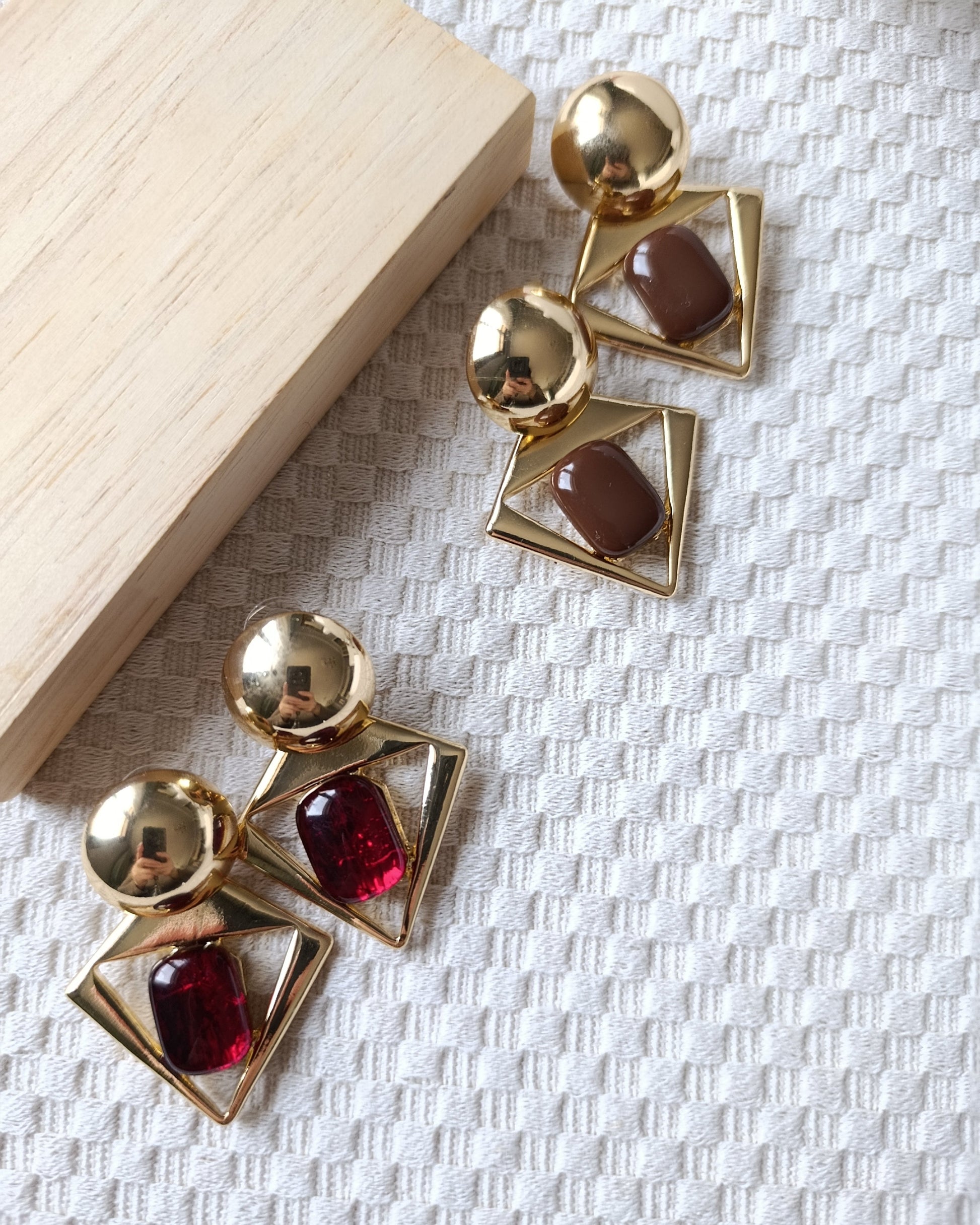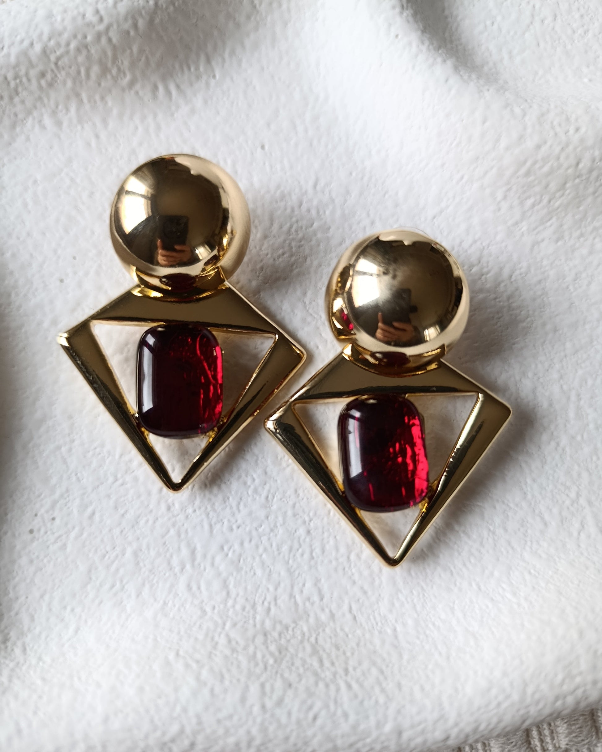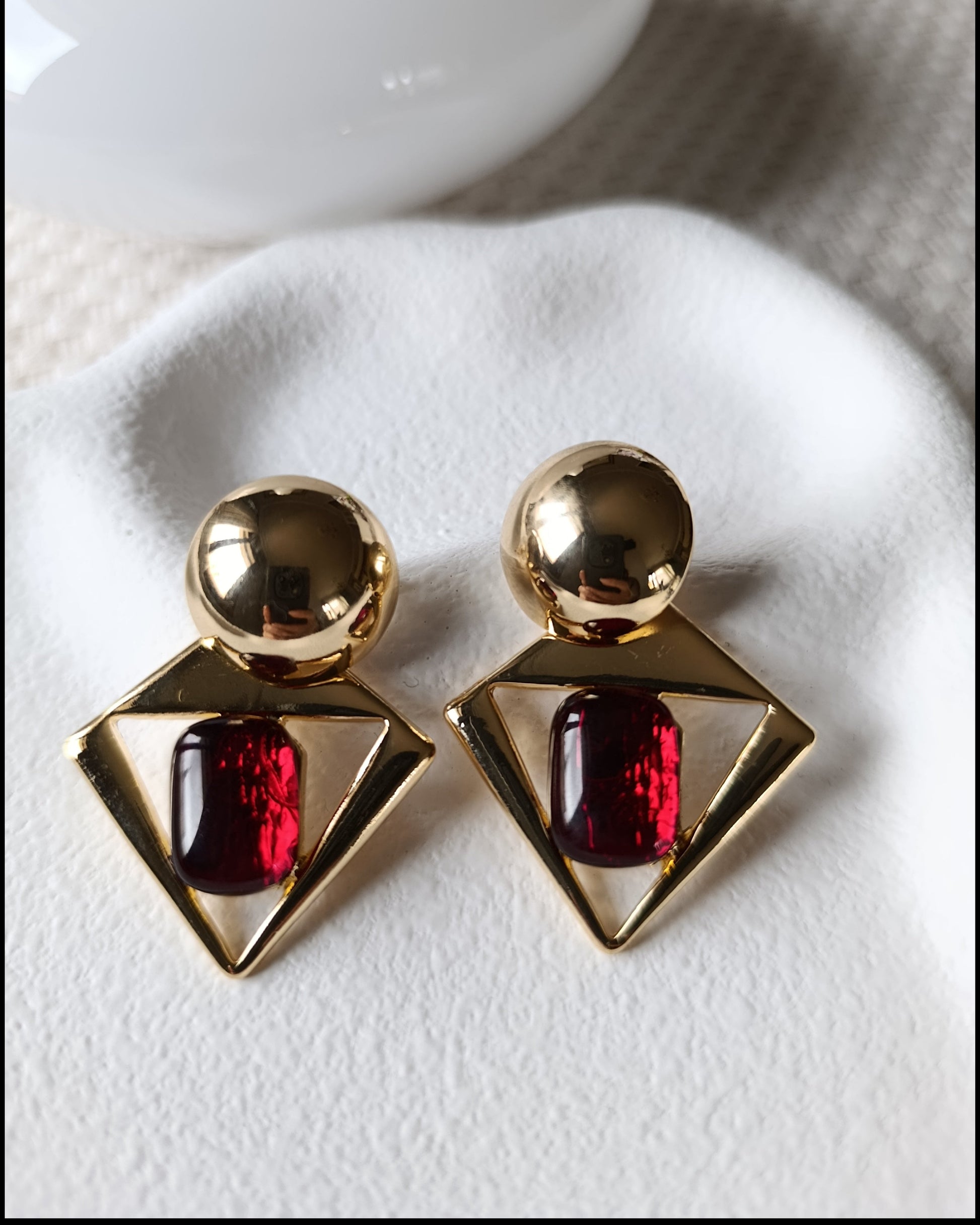 Günlük stilinize sofistike bir dokunuş katmaya ne dersiniz? Bu özel tasarım küpeler, altın rengi metalin parlaklığını, bordo taş detayının sıcaklığıyla birleştiriyor.