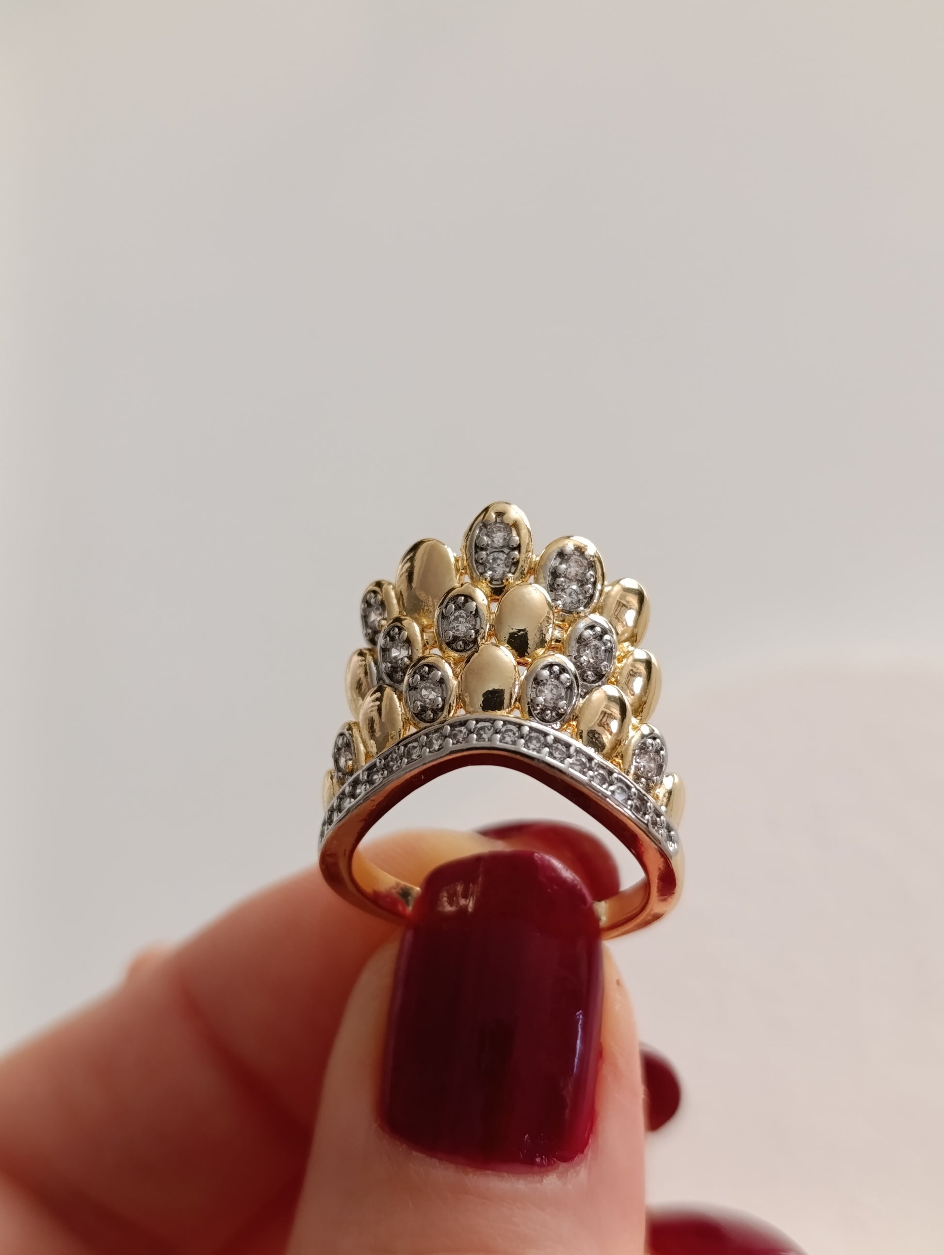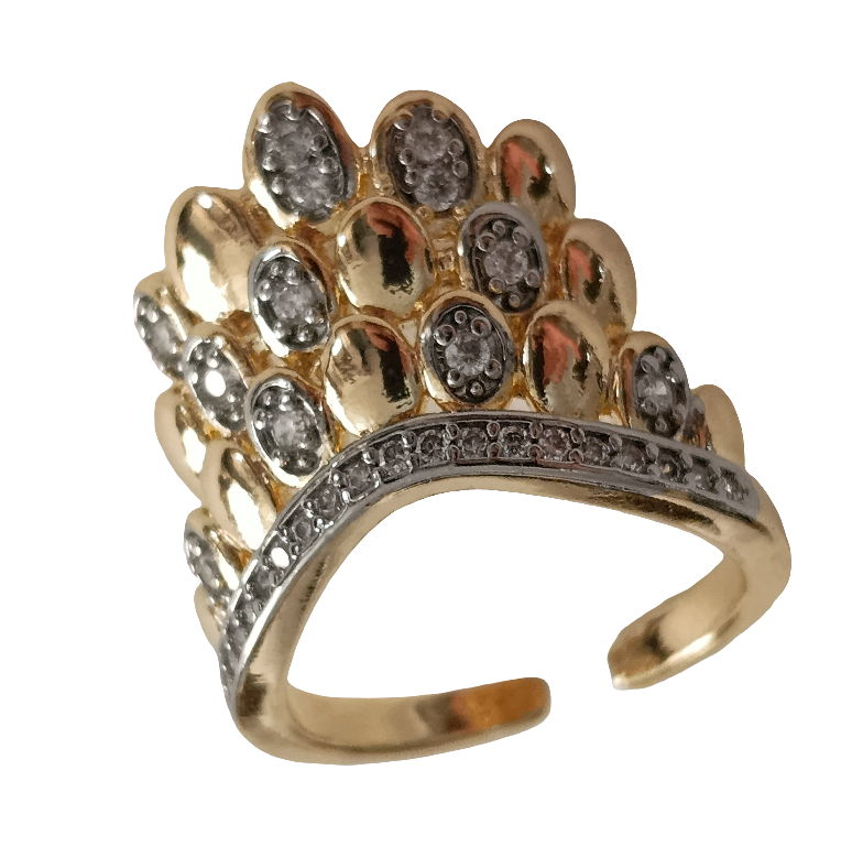 Modern ve göz alıcı bir tasarım olan bu yüzüğü ister tek başına kullanın ister diğer yüzüklerinizle kombinleyerek kendi tarzınızı yaratın. Altın tonlu / Gümüş tonlu gövde ve parlak taşların uyumu ile hazırlanan bu tasarım, her parmak ölçüsüne uyum sağlayabilen yapısıyla konforlu bir şıklık vadeder.