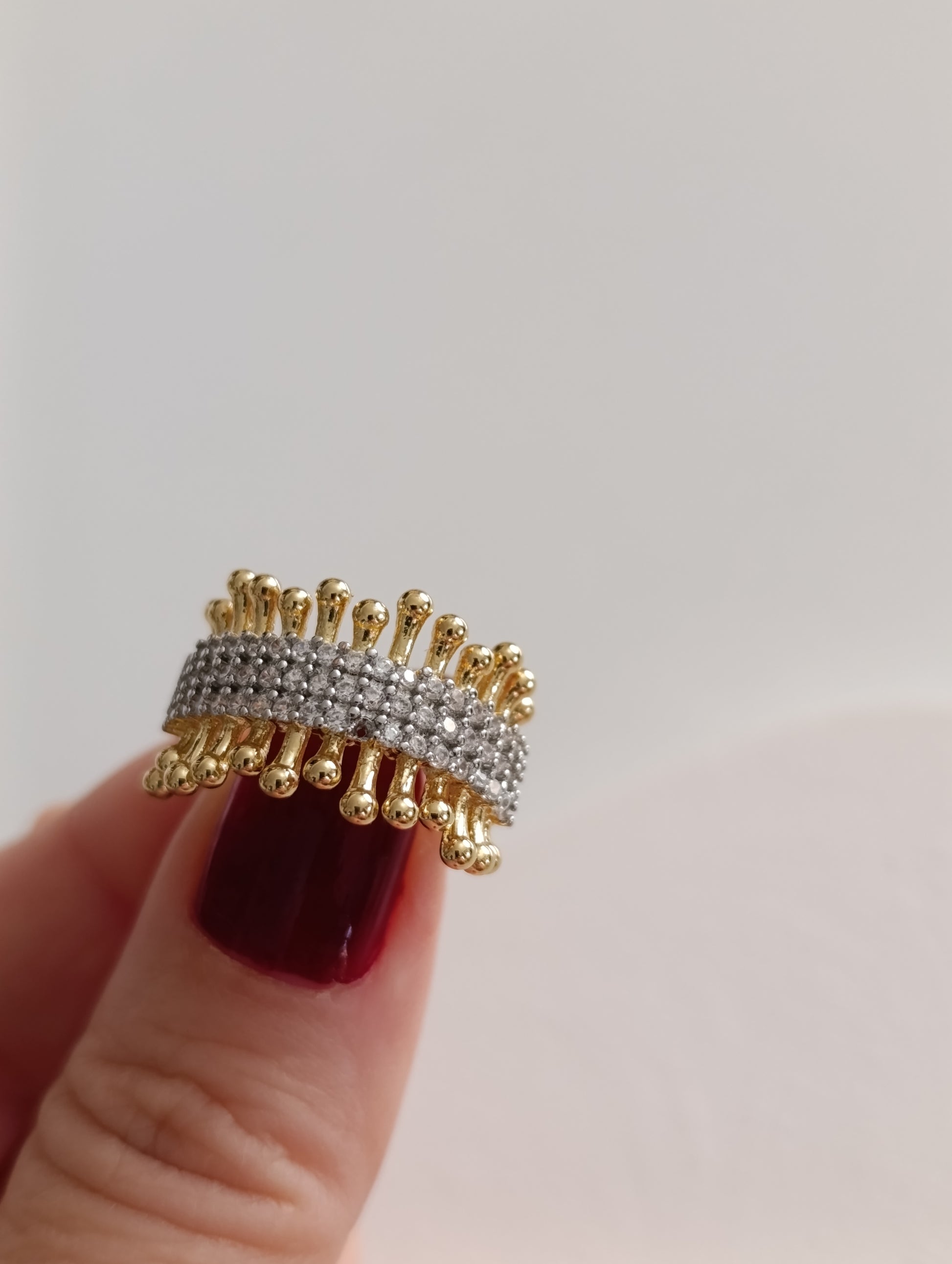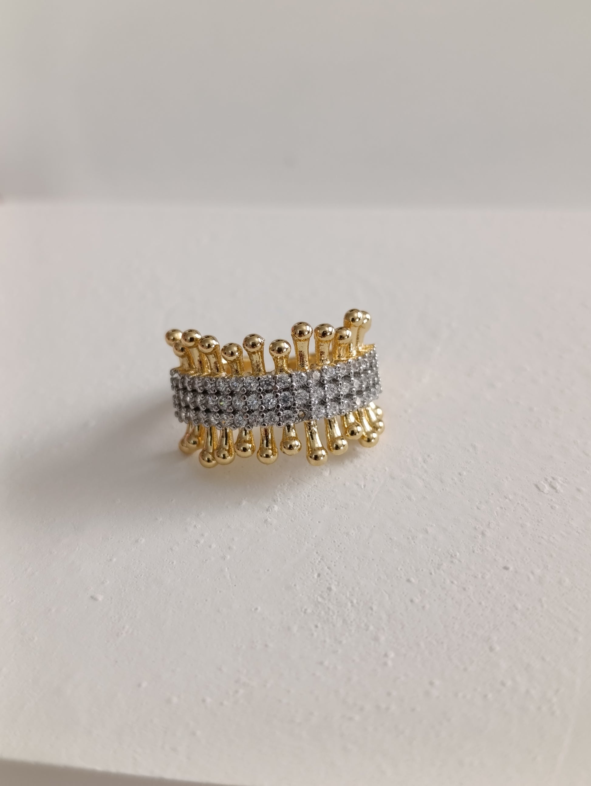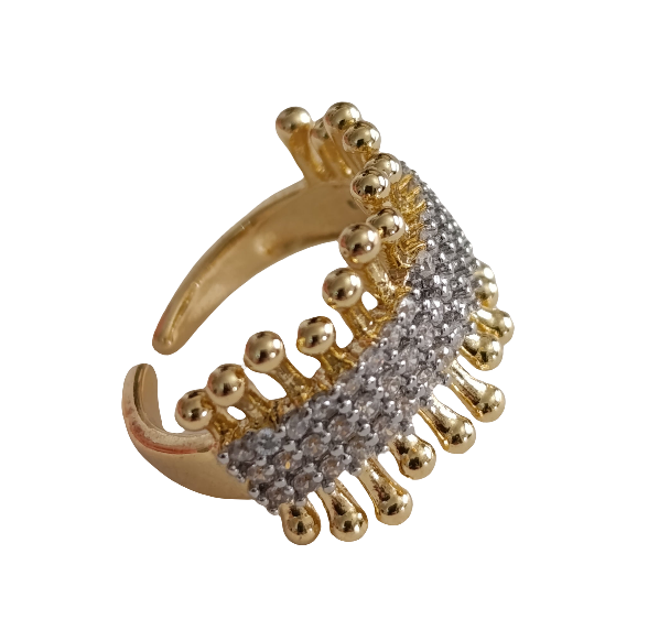 Modern ve göz alıcı bir tasarım olan bu yüzüğü ister tek başına kullanın ister diğer yüzüklerinizle kombinleyerek kendi tarzınızı yaratın. Altın tonlu / Gümüş tonlu gövde ve parlak taşların uyumu ile hazırlanan bu tasarım, her parmak ölçüsüne uyum sağlayabilen yapısıyla konforlu bir şıklık vadeder.