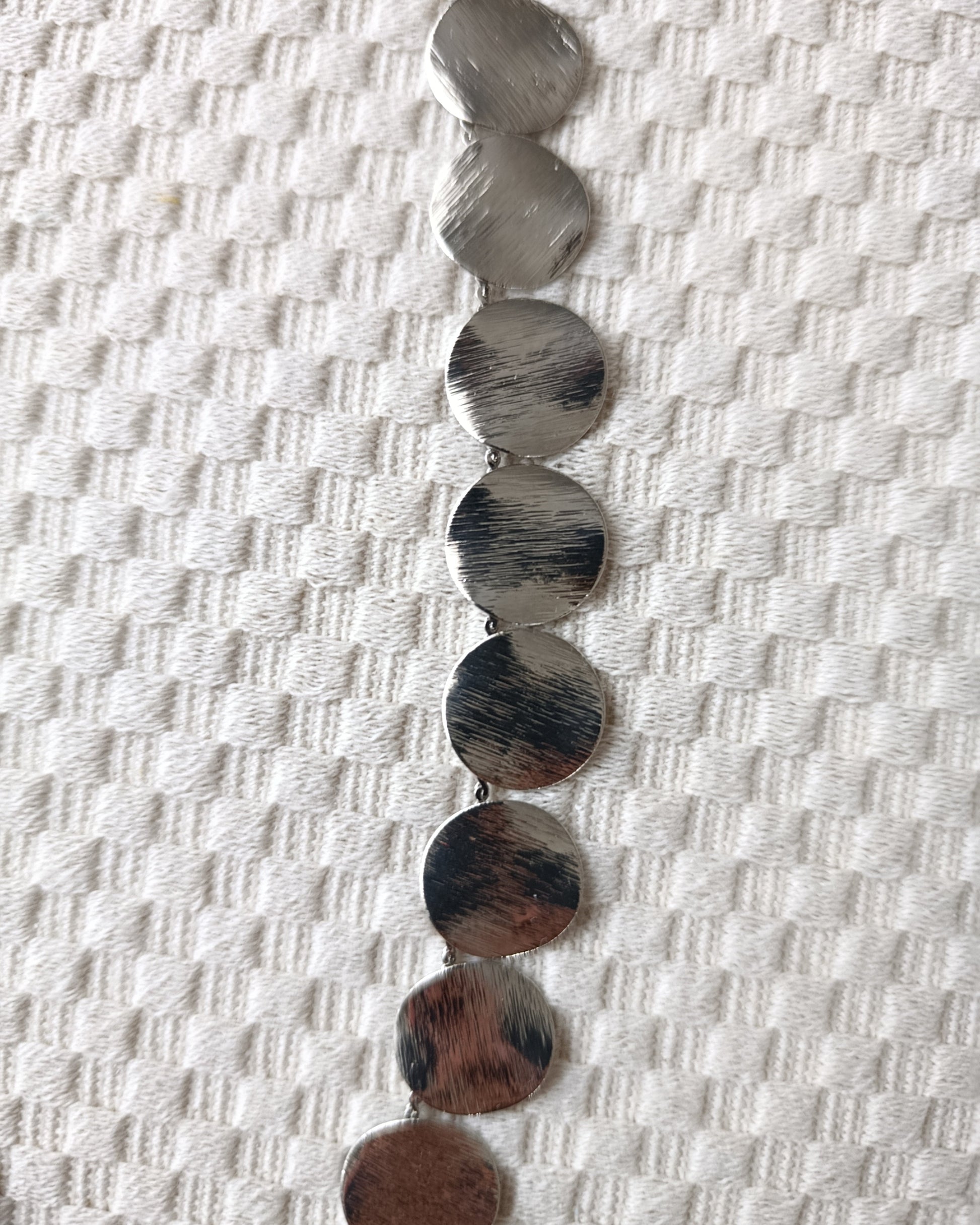 İç içe geçmiş, dövme metal efektli gümüş renkli dairesel plakalar.