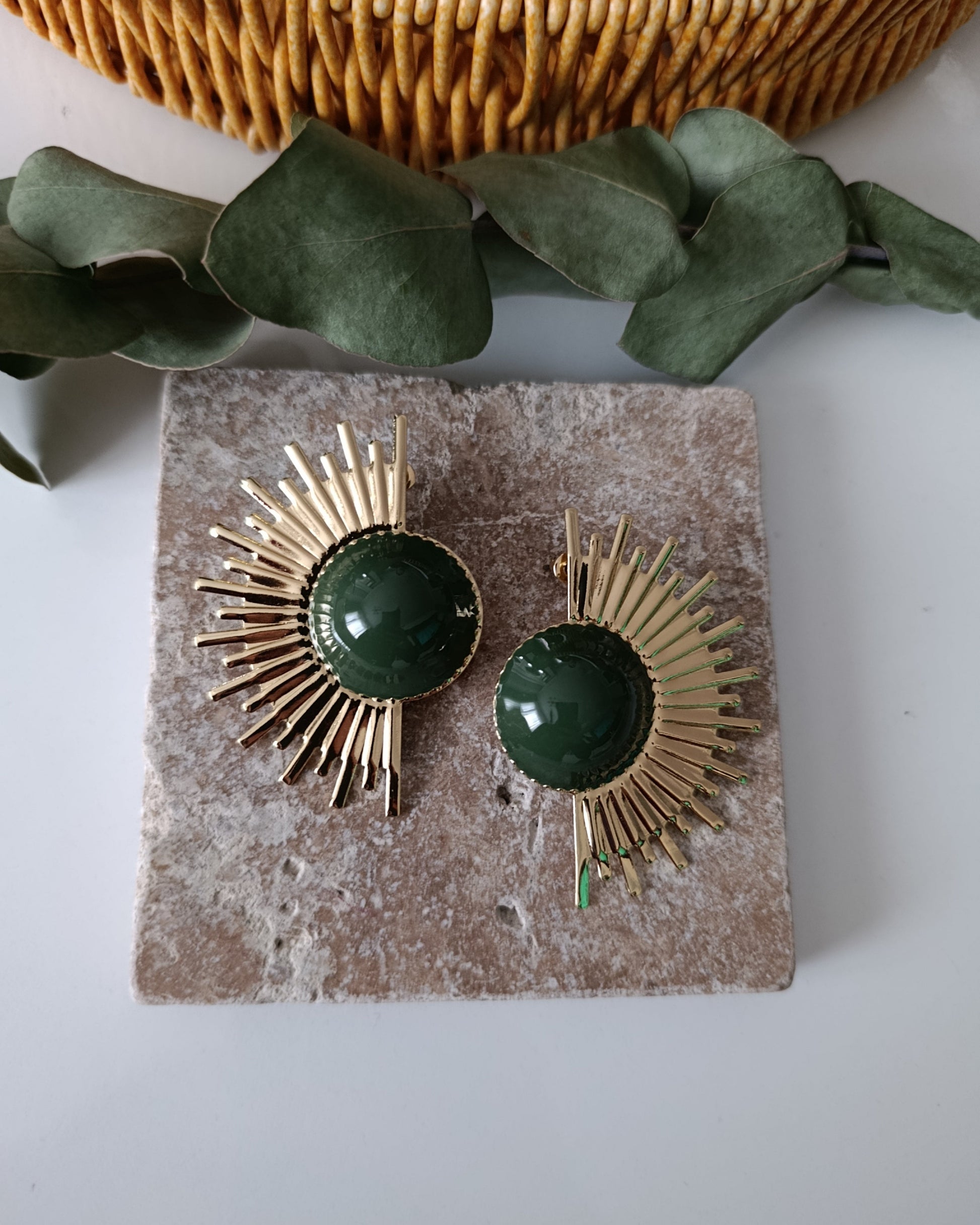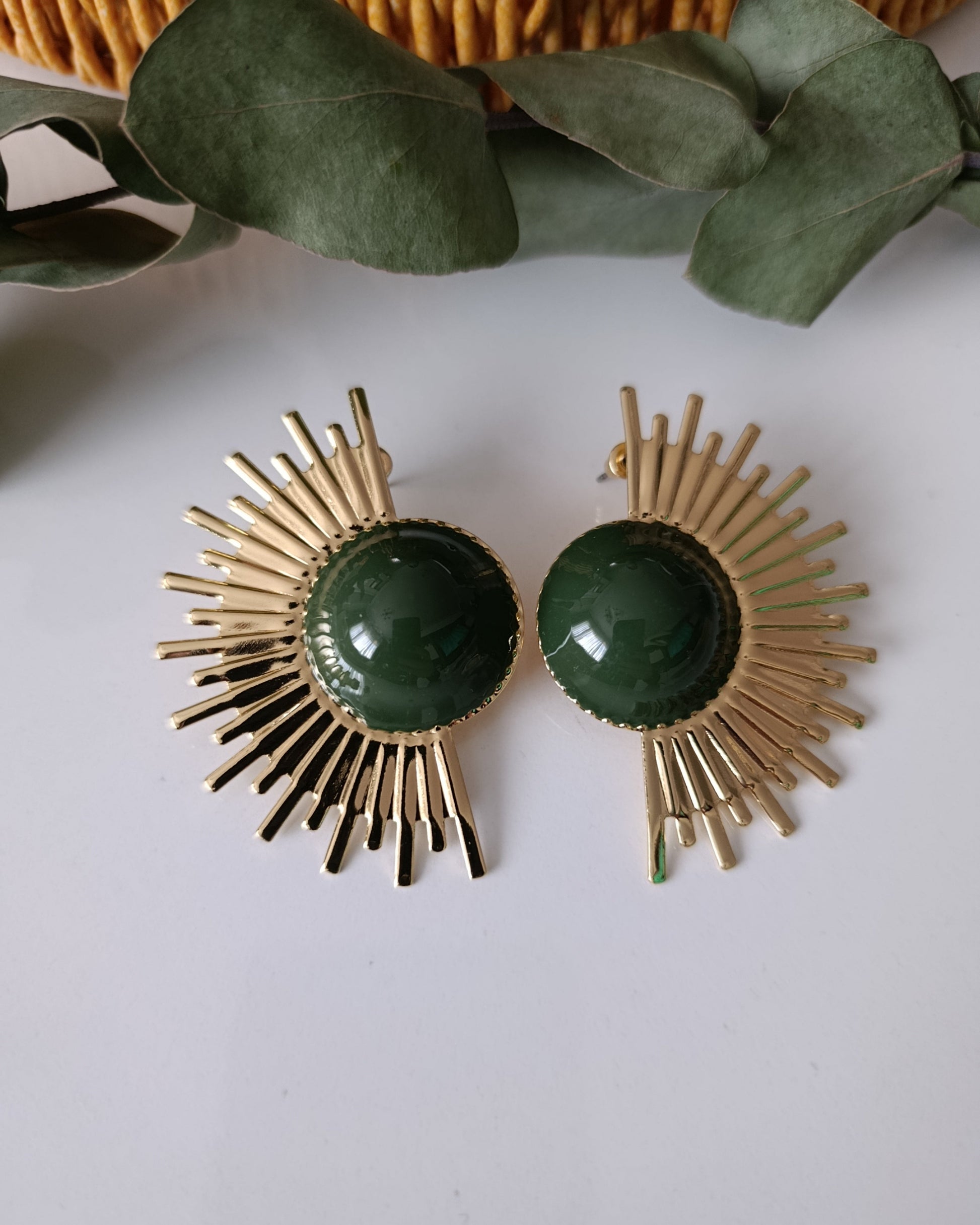 Günün her anında ışıldamanız için tasarlandı. Bu özel tasarım küpeler, derin zümrüt yeşili mine dokusunu, altın rengi güneş ışını (sunburst) detaylarıyla birleştiriyor. Hem retro bir hava taşıyan hem de modern hatlara sahip olan bu parça, sade bir kombini anında iddialı bir görünüme dönüştürür.