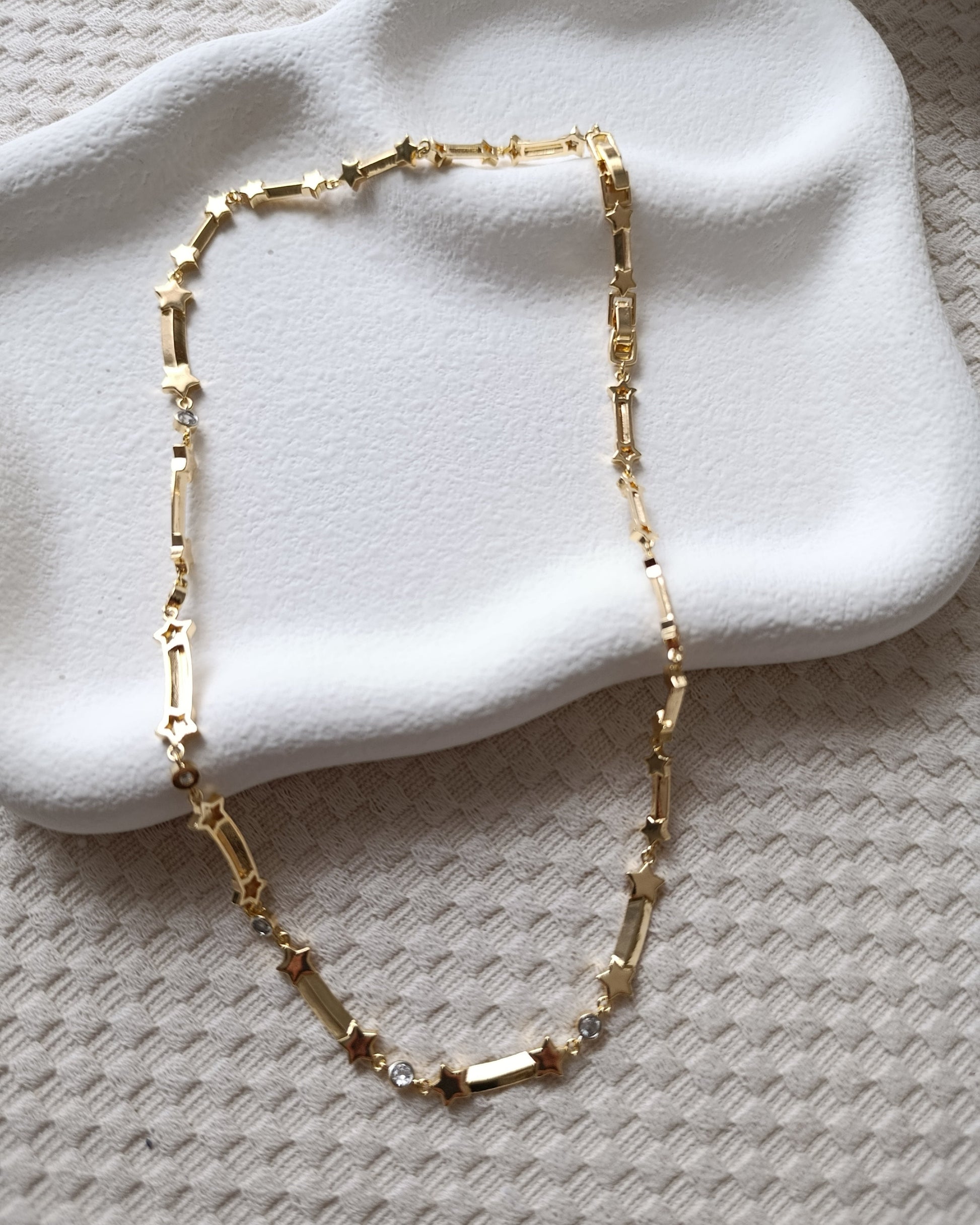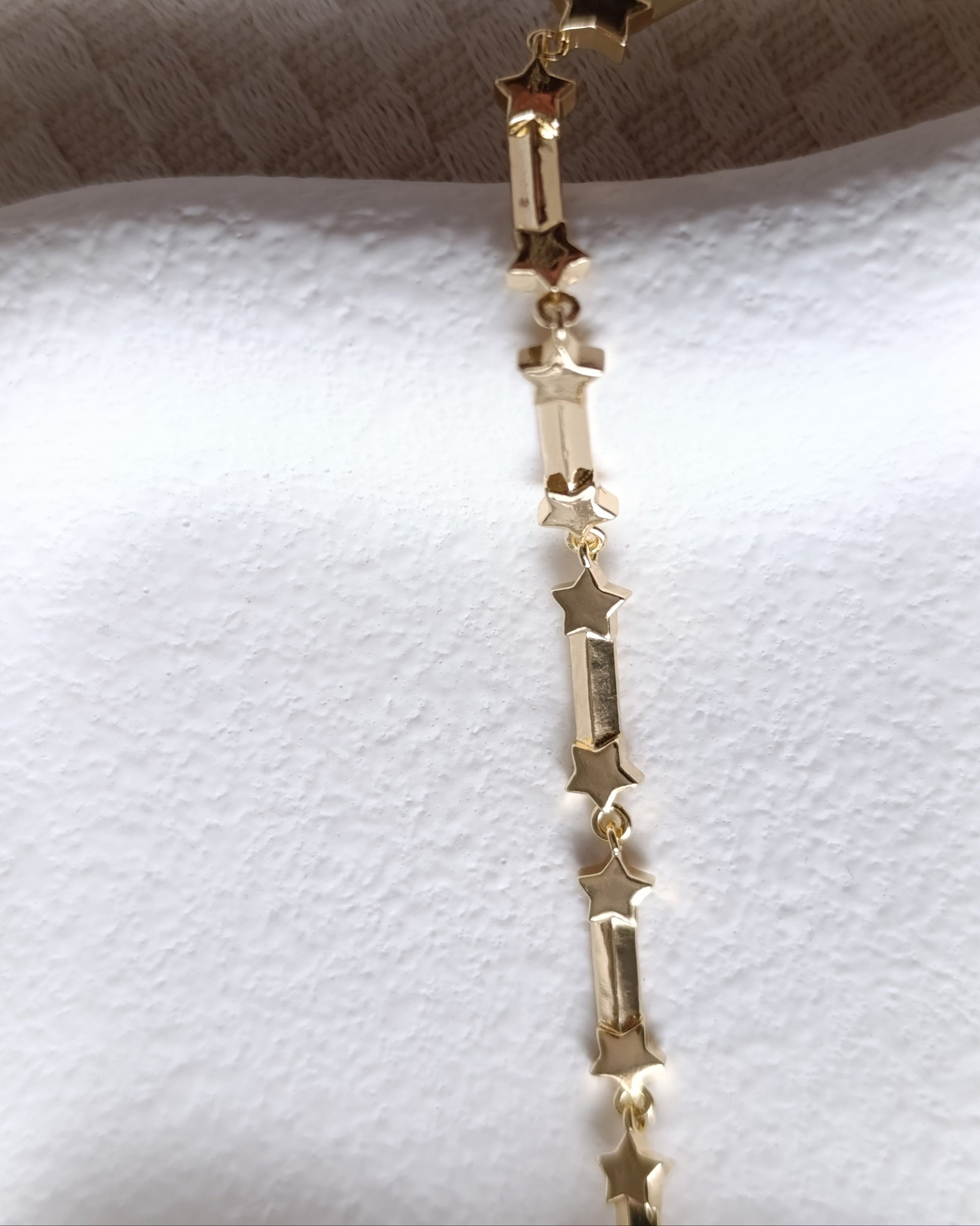 Altın tonlarında parlatılmış metal üzerine sıralı yıldız ve kristal taş kombinasyonu.