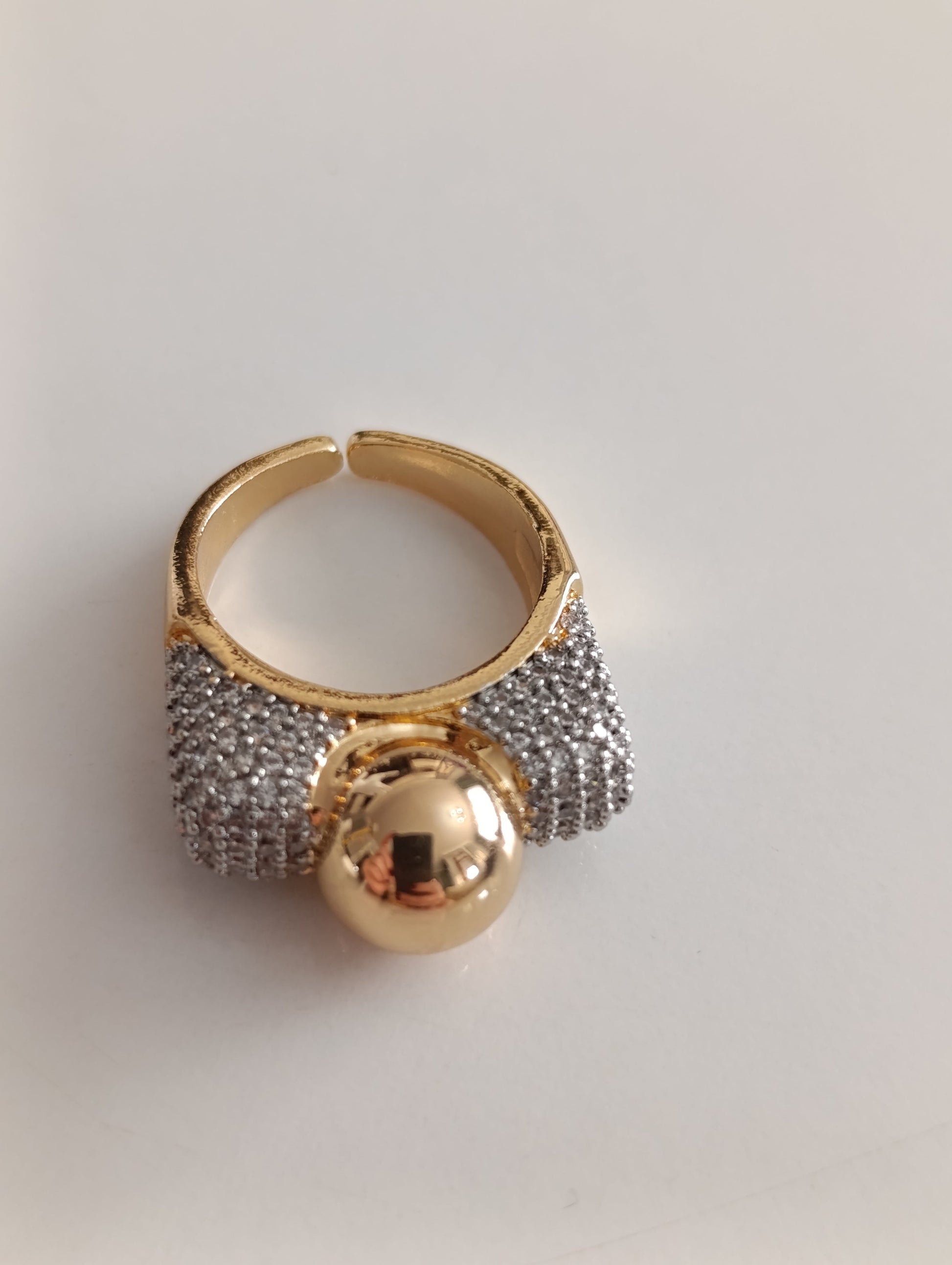 Modern ve göz alıcı bir tasarım olan bu yüzüğü ister tek başına kullanın ister diğer yüzüklerinizle kombinleyerek kendi tarzınızı yaratın. Altın tonlu / Gümüş tonlu gövde ve parlak taşların uyumu ile hazırlanan bu tasarım, her parmak ölçüsüne uyum sağlayabilen yapısıyla konforlu bir şıklık vadeder.