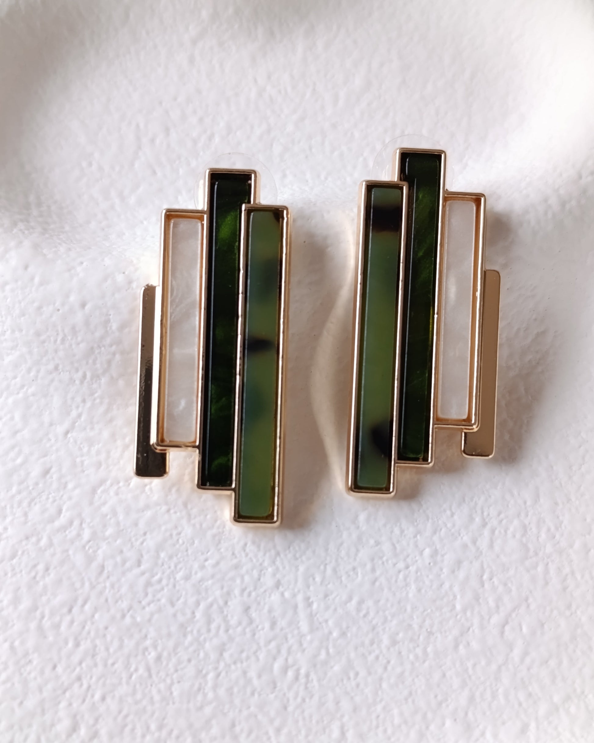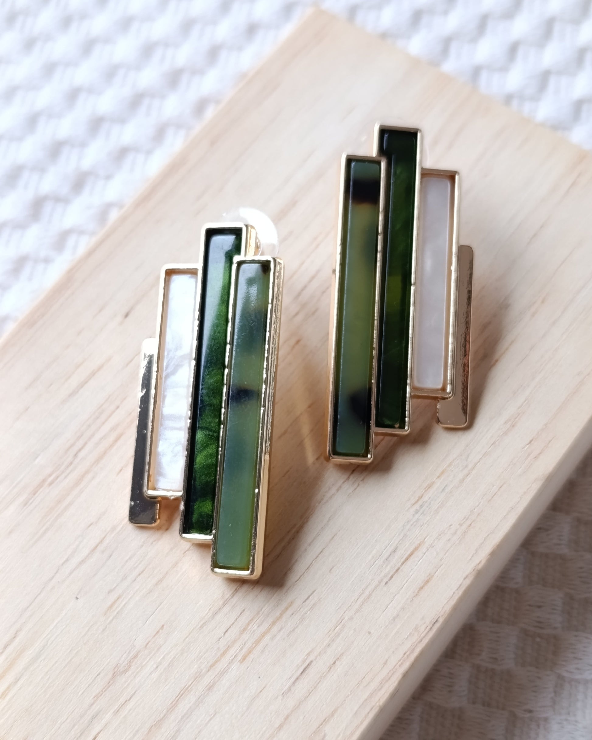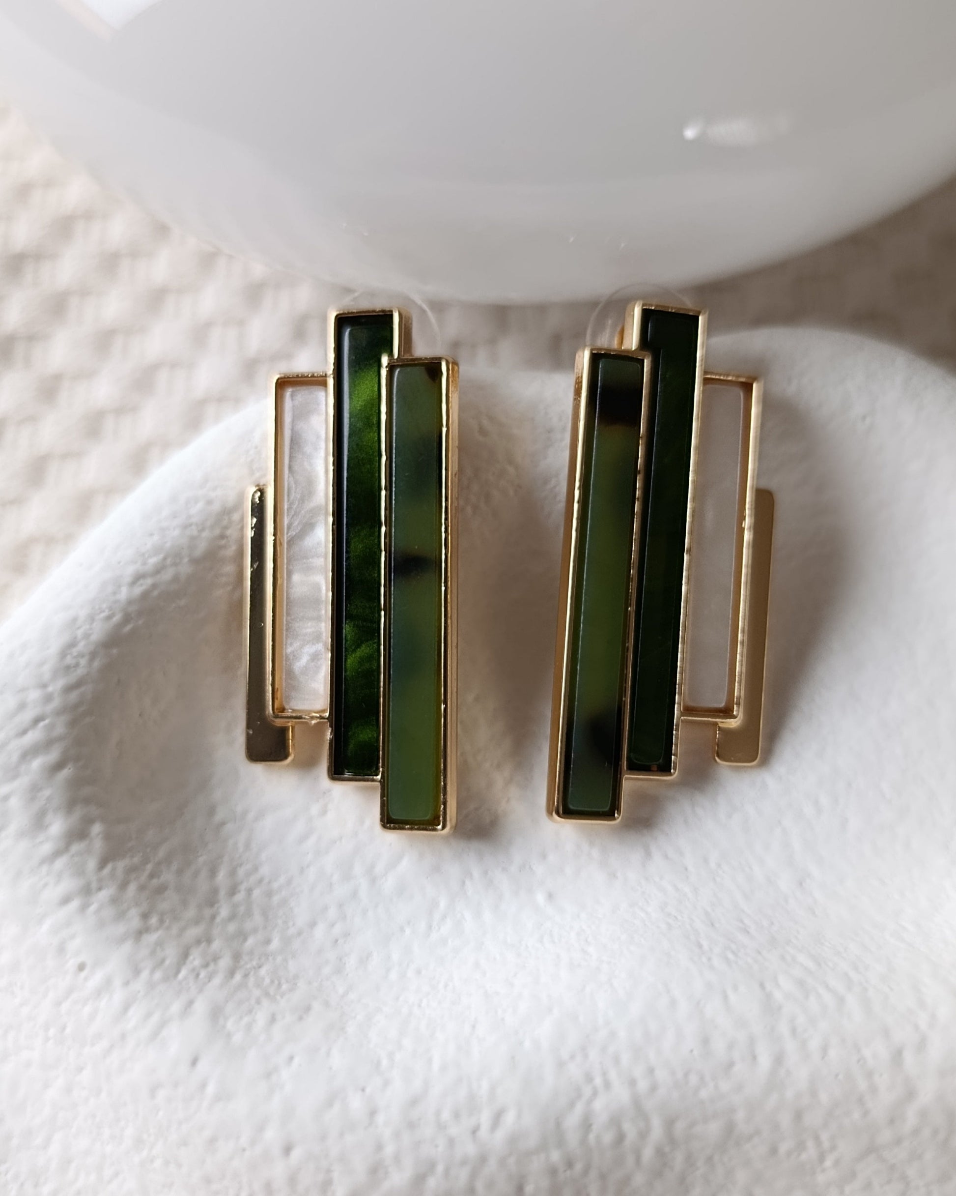 Geçmişin ihtişamını modern çizgilerle keşfedin! Bu özel tasarım küpeler, dikey formları ve yeşil-sedef renk geçişleriyle stilinize sanatsal bir derinlik katıyor.