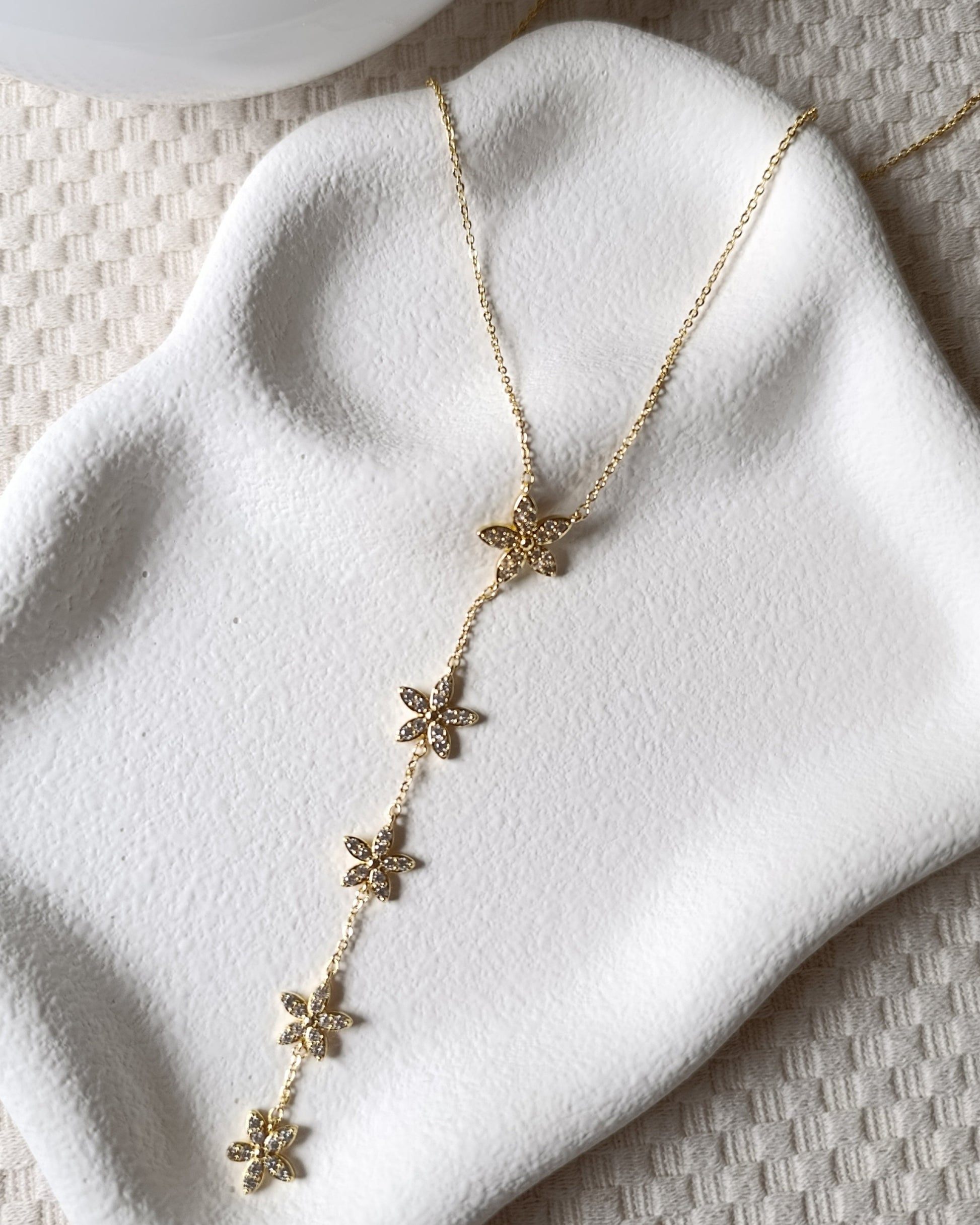 İnce zincir üzerinde dikey olarak sıralanmış taşlı çiçek figürleri (Lariat/Y model).