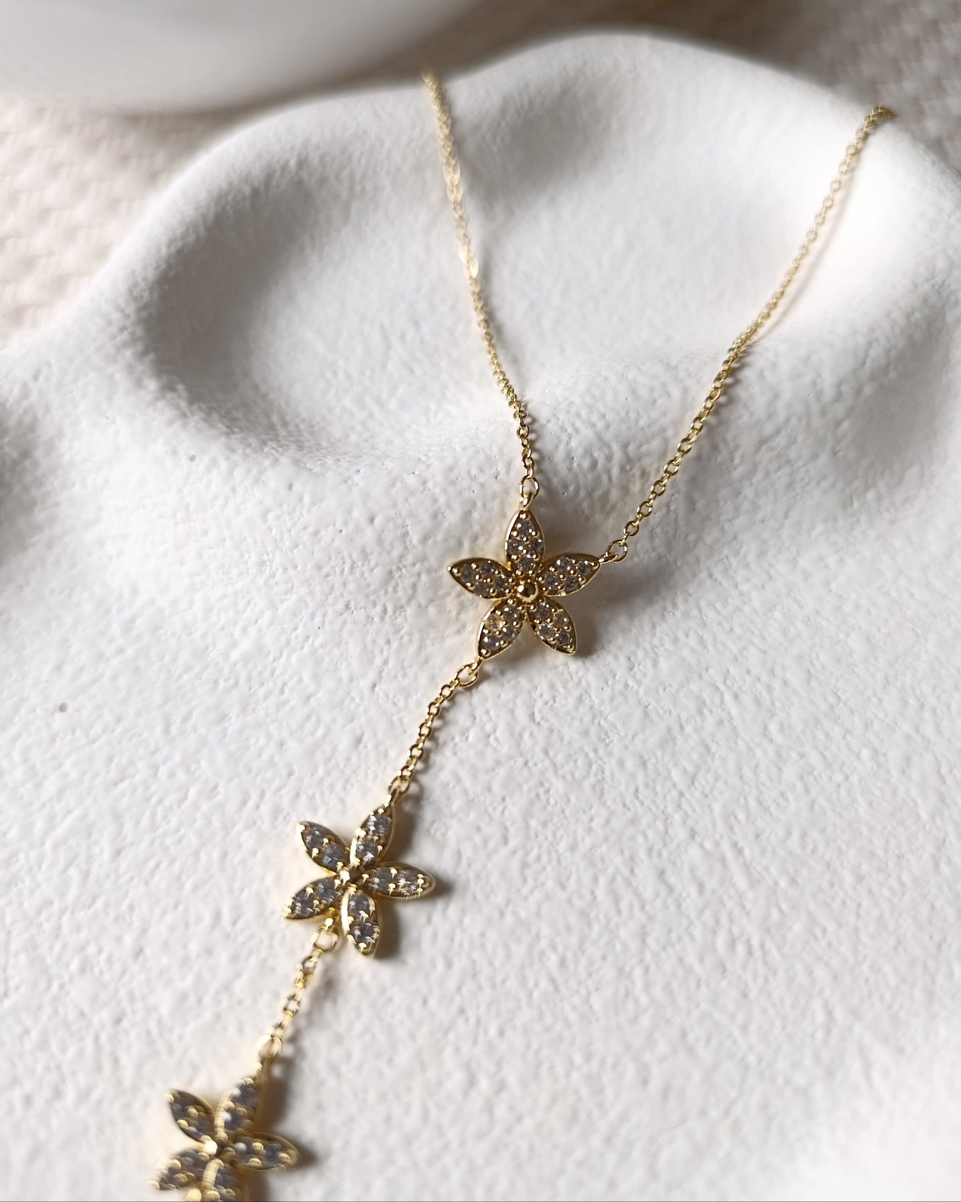 Baharın ışıltısını boynunuzda taşıyın! Bu özel tasarım Y formundaki kolye, birbiri ardına sıralanan beş adet zarif çiçek figürüyle stilinize romantik bir dokunuş katar. Her bir çiçeğin merkezindeki zirkon taşları, en hafif ışıkta bile göz alıcı bir parıltı sunar. Zarif sarkıt yapısı sayesinde özellikle V yaka elbiseler ve derin dekolteler için eşsiz bir tamamlayıcıdır.